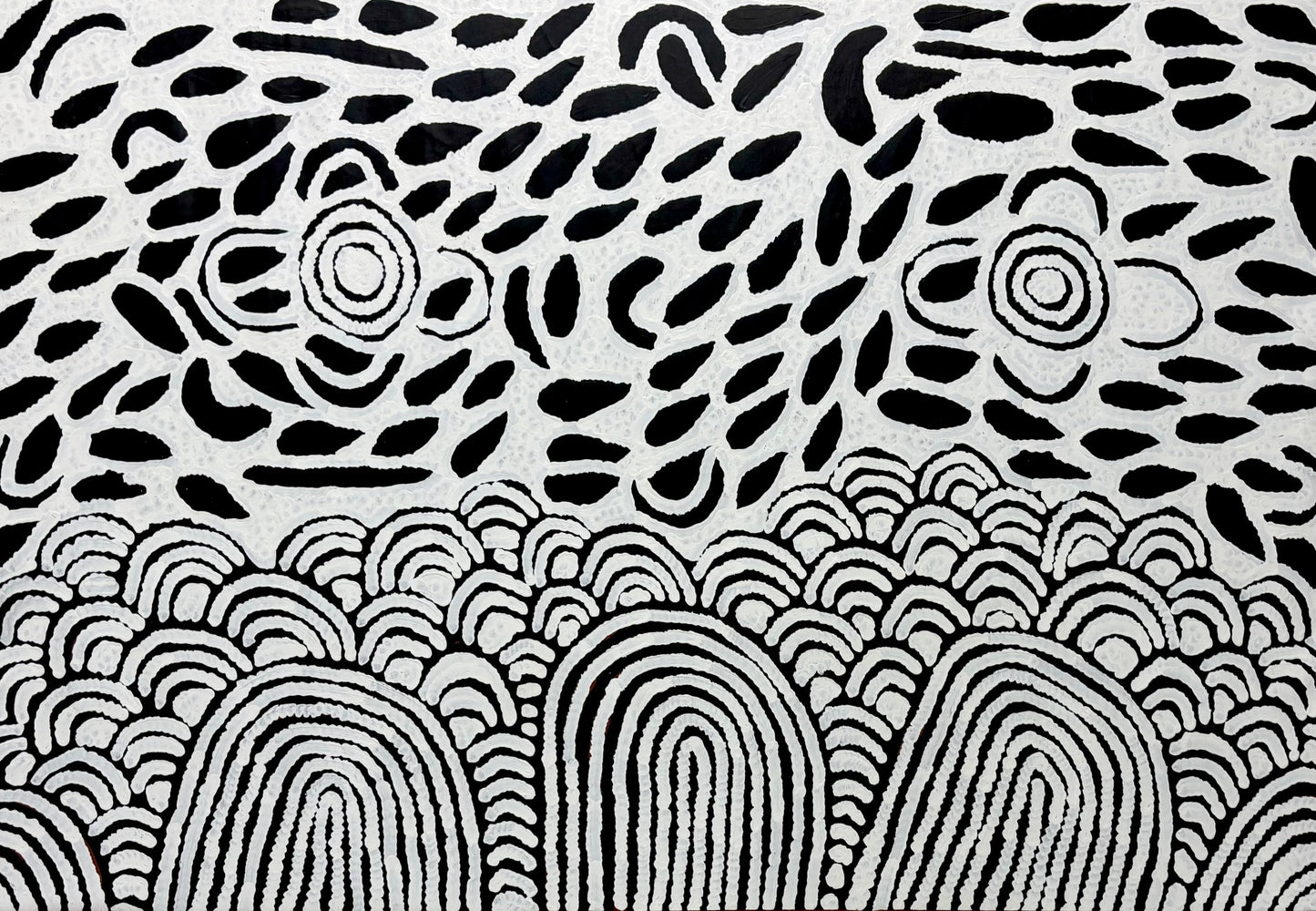 Barbara’s works show the depictions of puli – (rock formations) and tuli – (sand hills), the land formations that are attributed to the land from which she comes. Also seen in many of Barbara’s works are the sacred women’s stories (Minyma), descriptions of the role of the women as healers and providers within Ngaanyatjarra society.