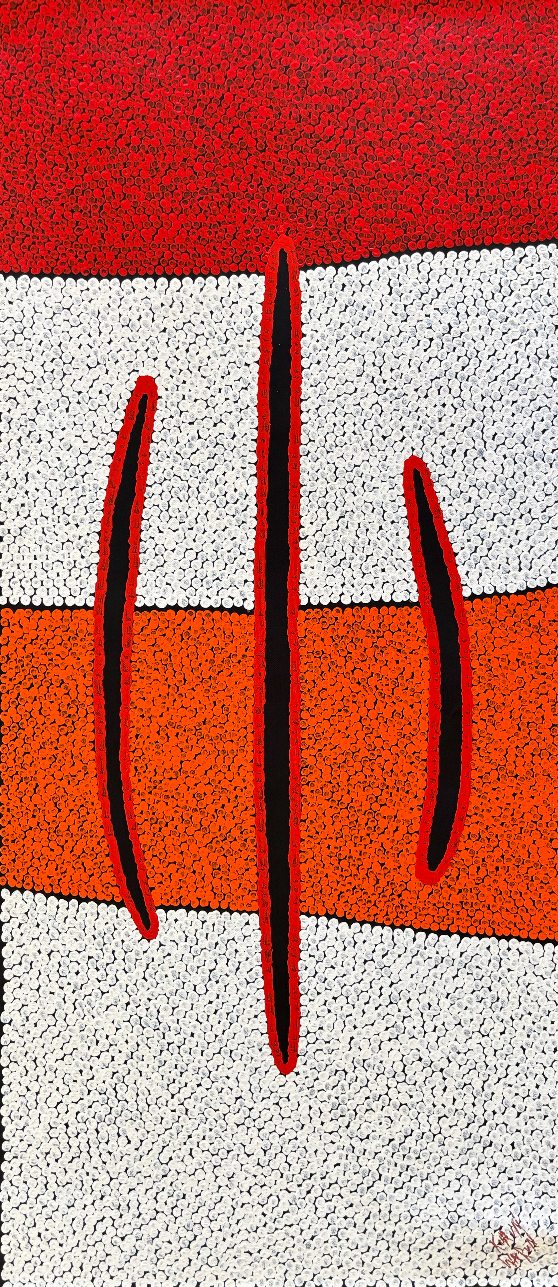 My aboriginal dot paintings have a traditional meaning, which is not always immediately noticed, but within the colours, lines, and space, you can see an underlying story. My use of contrasts are done so that the overall piece is left striking but peaceful.