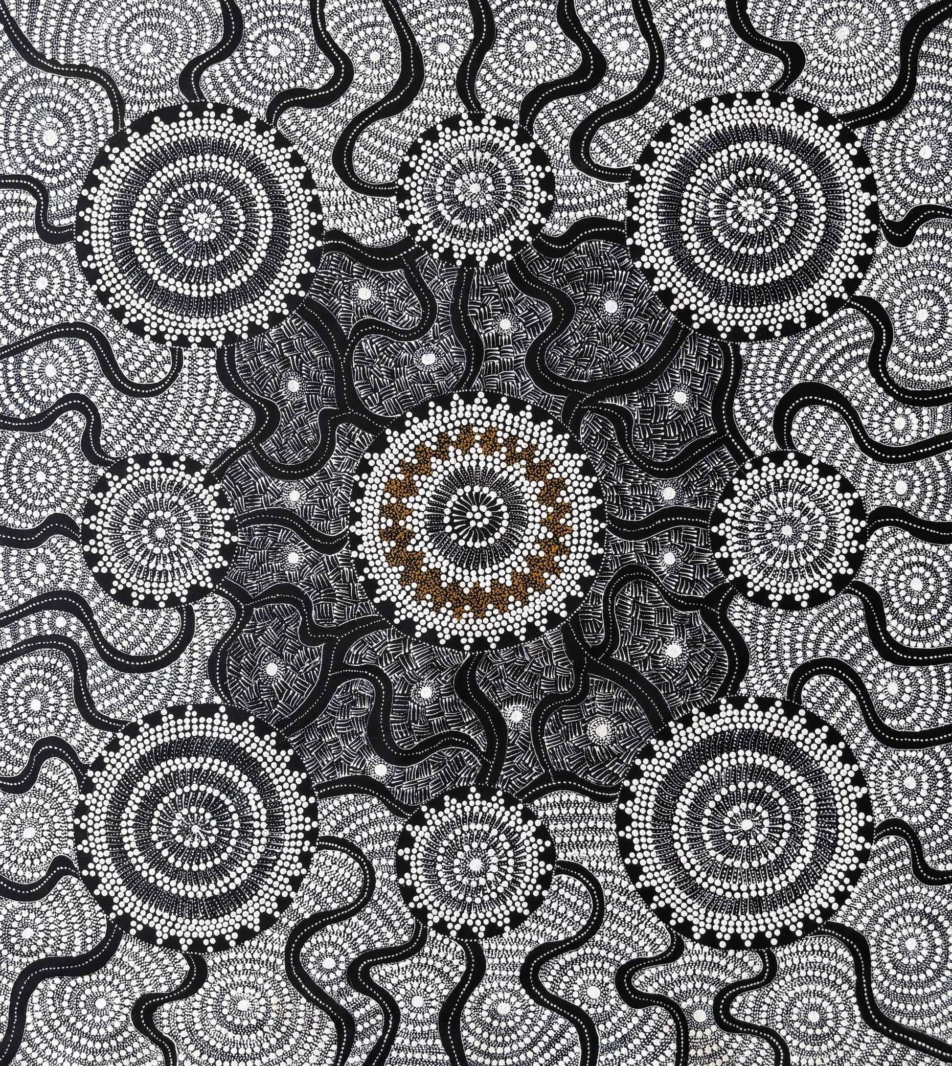 Doreen's artworks frequently depict women's ceremonies and business, as well as her Ngurlu ('Damper Seed Dreaming'), which utilizes a fine dotting technique in black and white, resulting in striking and complex compositions. Doreen is innovative in her artistic approach, incorporating traditional Aboriginal iconography and symbols in her Women's Ceremonies paintings while offering bold interpretations of body paint designs used during significant ceremonial activities.