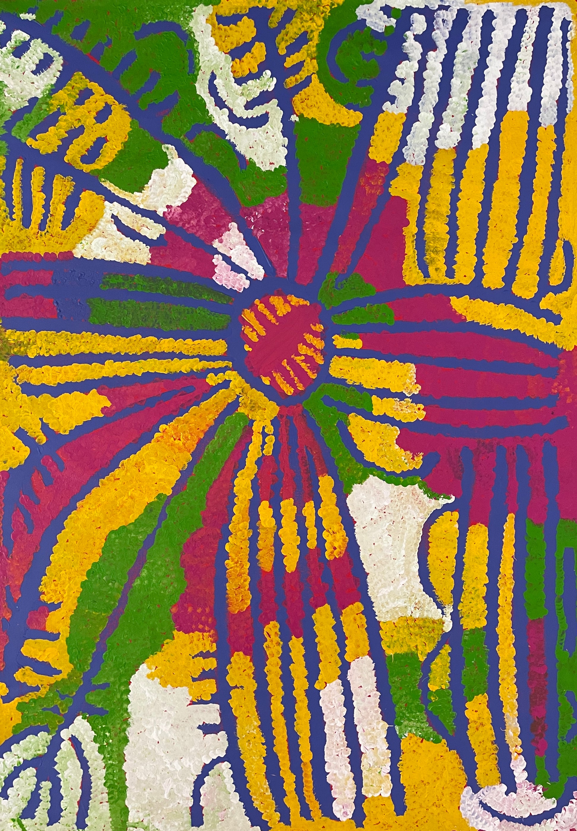 Lorna Fencer Naparrula was a senior artist from Lajamanu, in central Northern Territory. She was born around 1924, near where the Granites mine is now situated in the Tanami Desert. She was the custodian of “Yummurrpa” country and the Caterpillar and Bush Potato (Yam) Dreaming that are associated with that land.