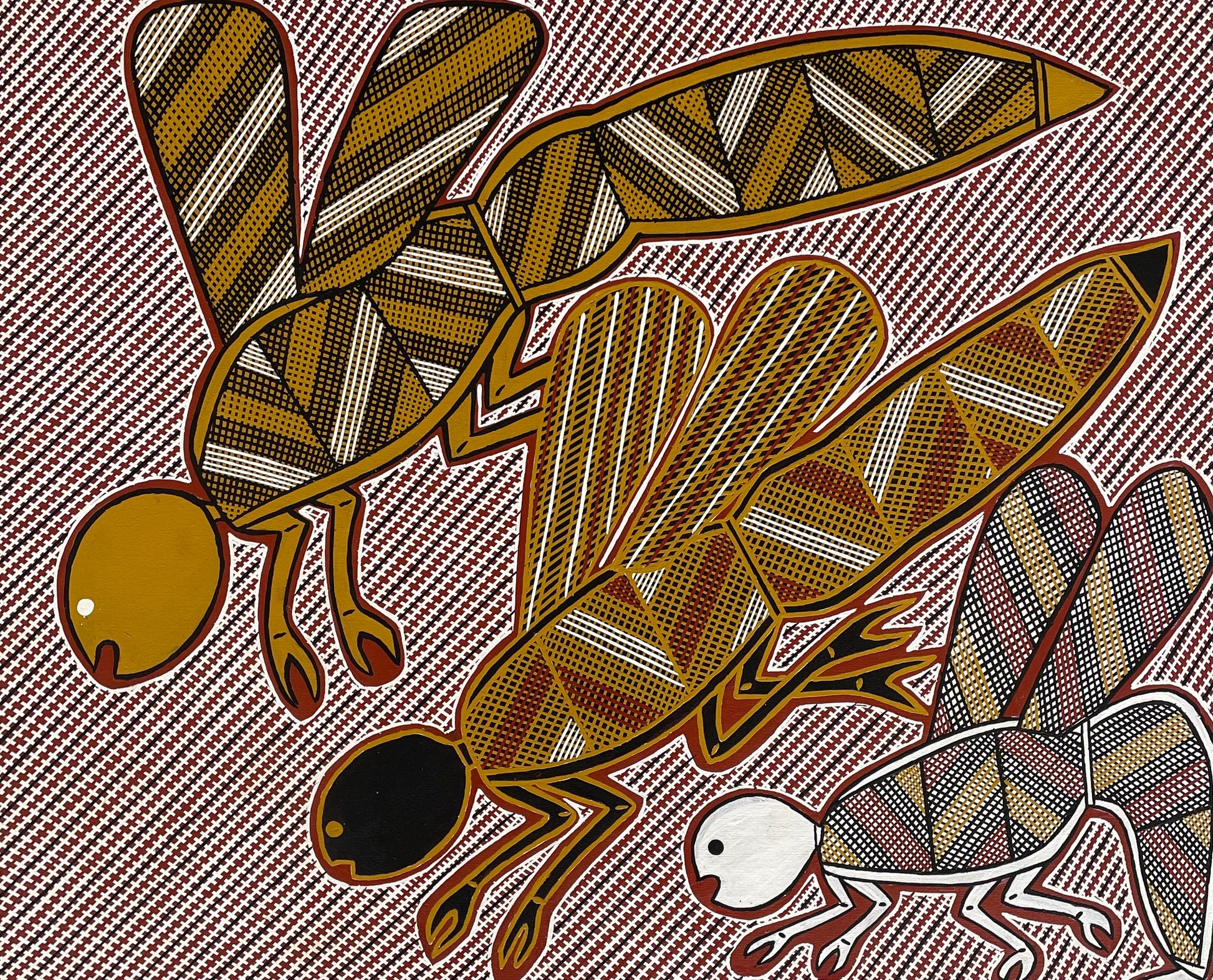 He uses the technique taught to him by first covering the canvas with a chosen colour, then the body of an animal is outlined and filled in using rarrk, also known as cross-hatching. To achieve these lines, a brush made from human hair or a special grass called Jarlk is used.