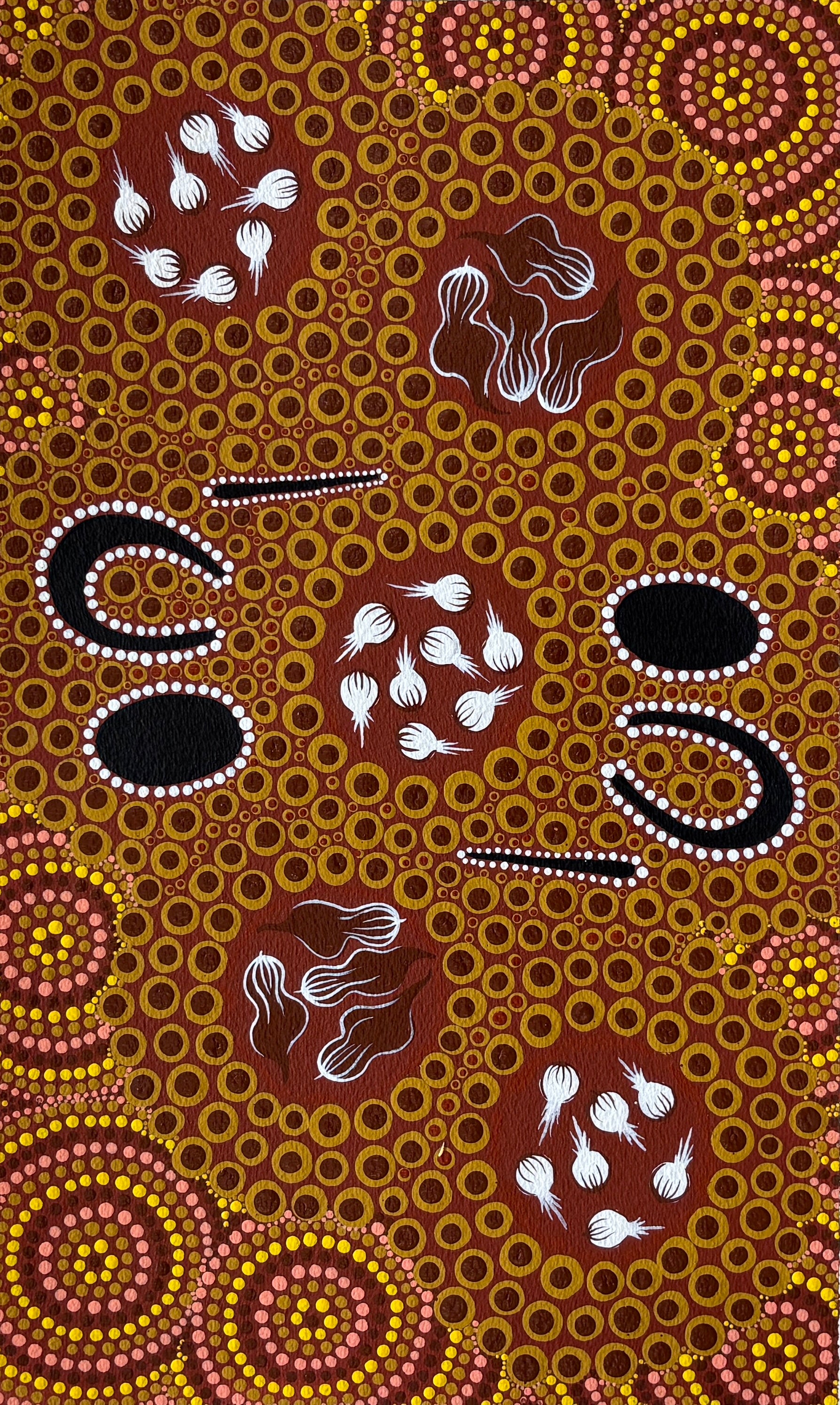 She has been painting since the year 2000, following in the footsteps of her family. She combines the Dreamings of her mother and father, focusing on the traditional role of women who gather bush fruit and Dreamtime creation stories from her mother’s side, incorporating the dot art she learnt from her father.